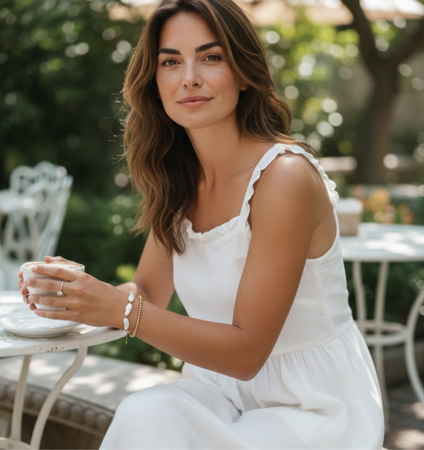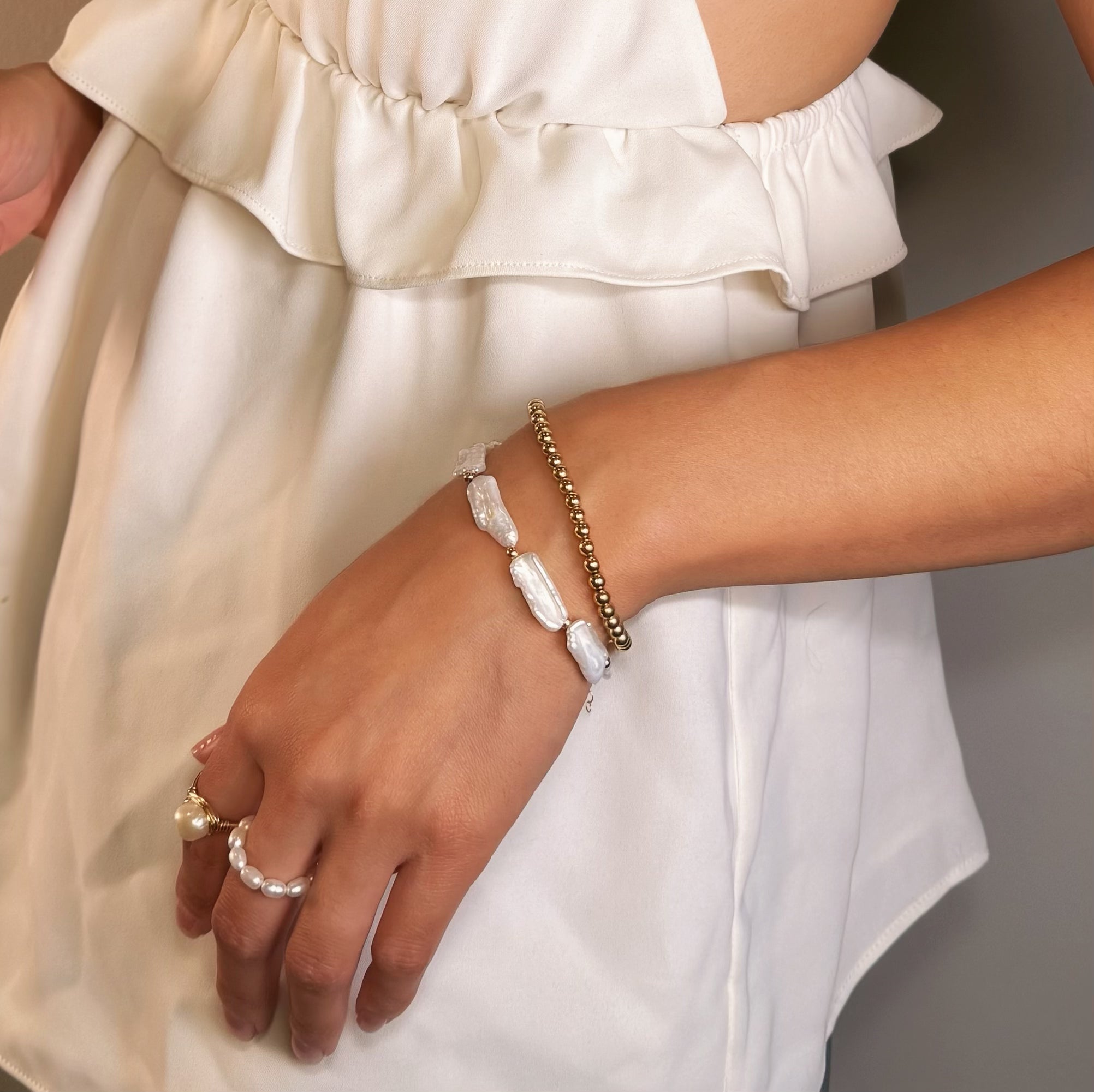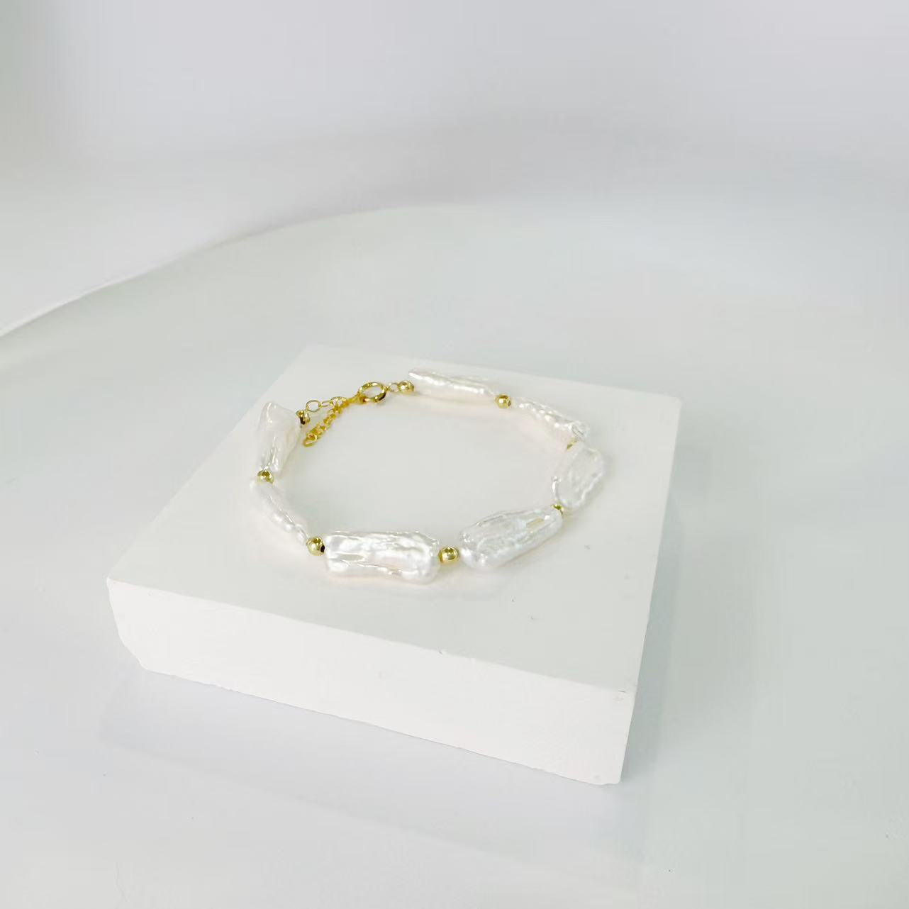 Discover the Geometric Muse Pearl Bracelet, a bold and artistic statement that redefines pearl elegance. This piece showcases a collection of irregular, rectangular-shaped baroque pearls, each one a unique natural sculpture that blends structured lines with organic beauty.