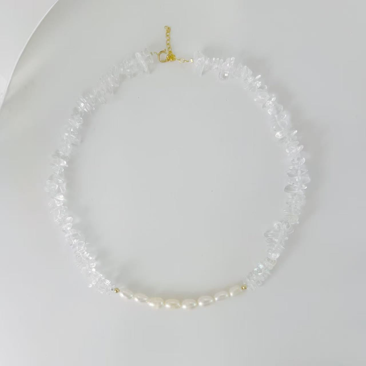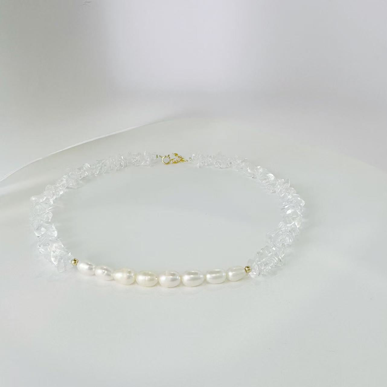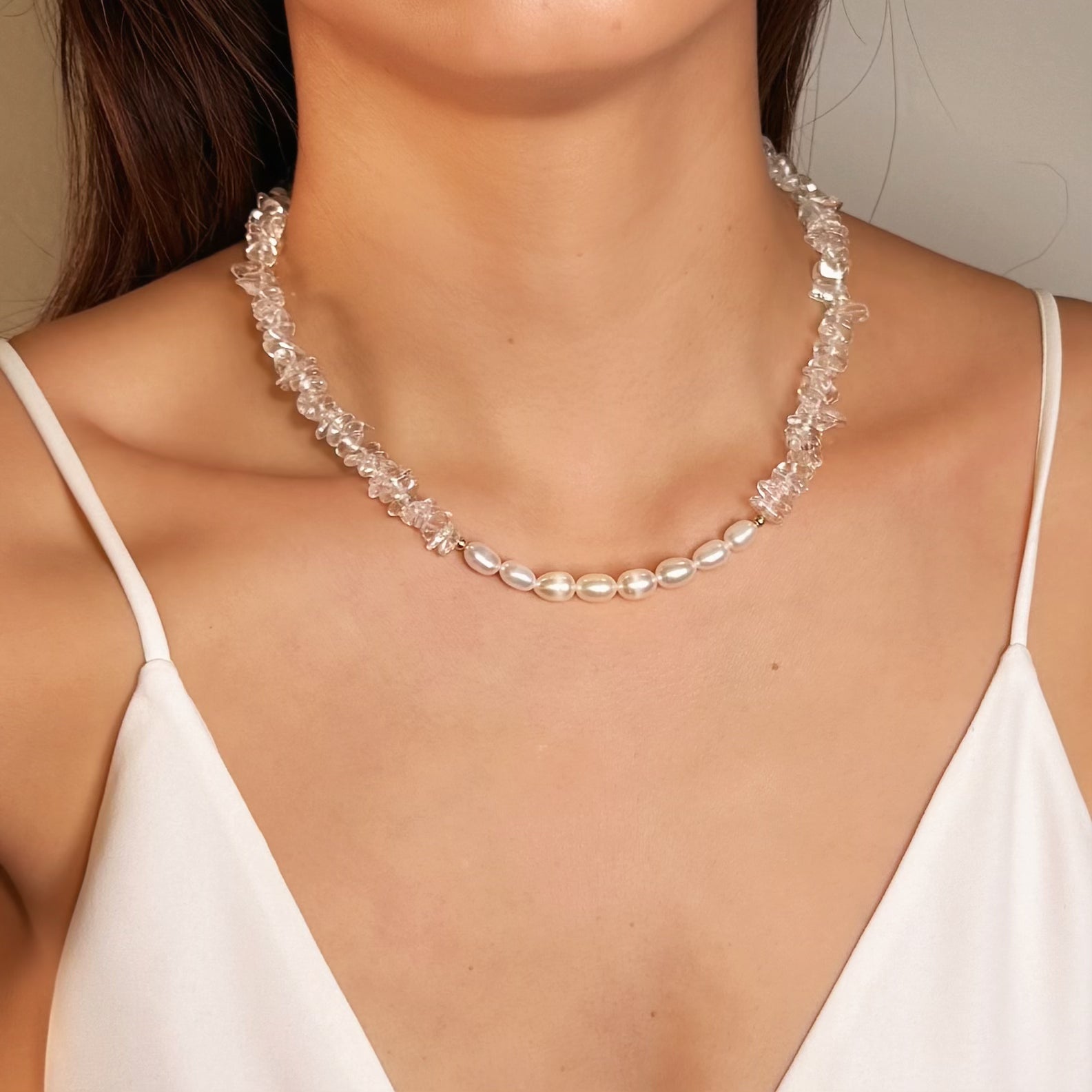 Discover the Aura of Serenity Necklace, a harmonious blend of nature's purest treasures. This exquisite piece marries the cleansing clarity of white quartz crystals with the soft, luminous glow of cultured pearls, creating a necklace that is as spiritually uplifting as it is beautiful.