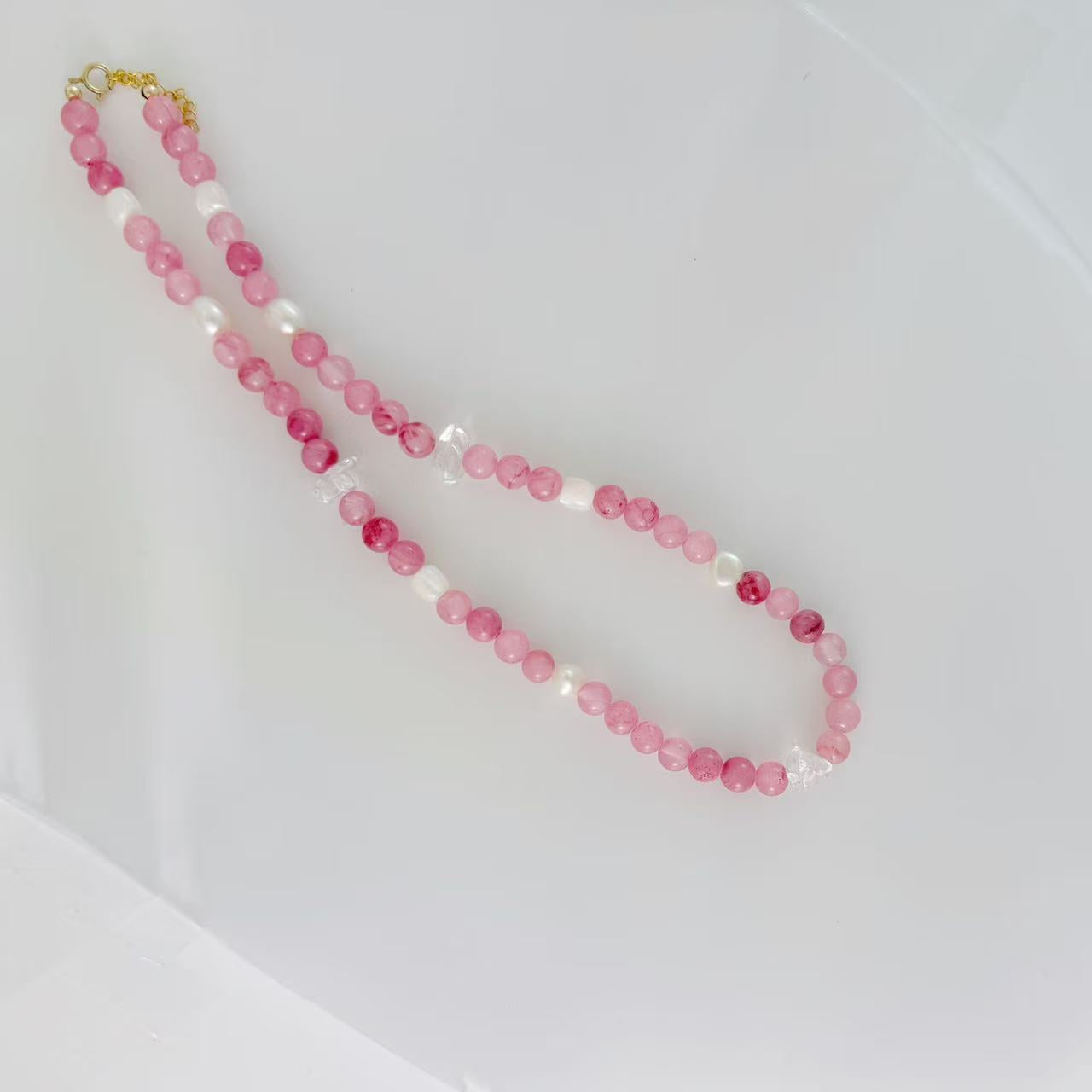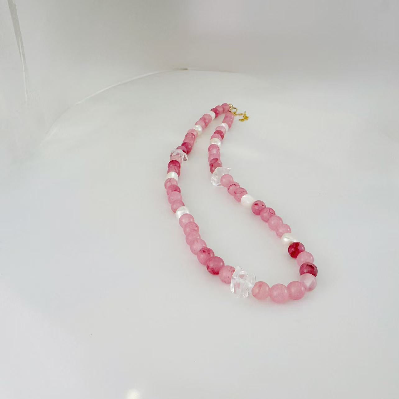 Discover the Blossom Harmony Necklace, a poetic symphony of gemstones that celebrates softness, clarity, and grace. This exquisite piece artfully intertwines the gentle blush of pink chalcedony, the pure sparkle of clear crystal, and the timeless luster of pearl, creating a necklace that is both a joy to wear and a balm for the soul.